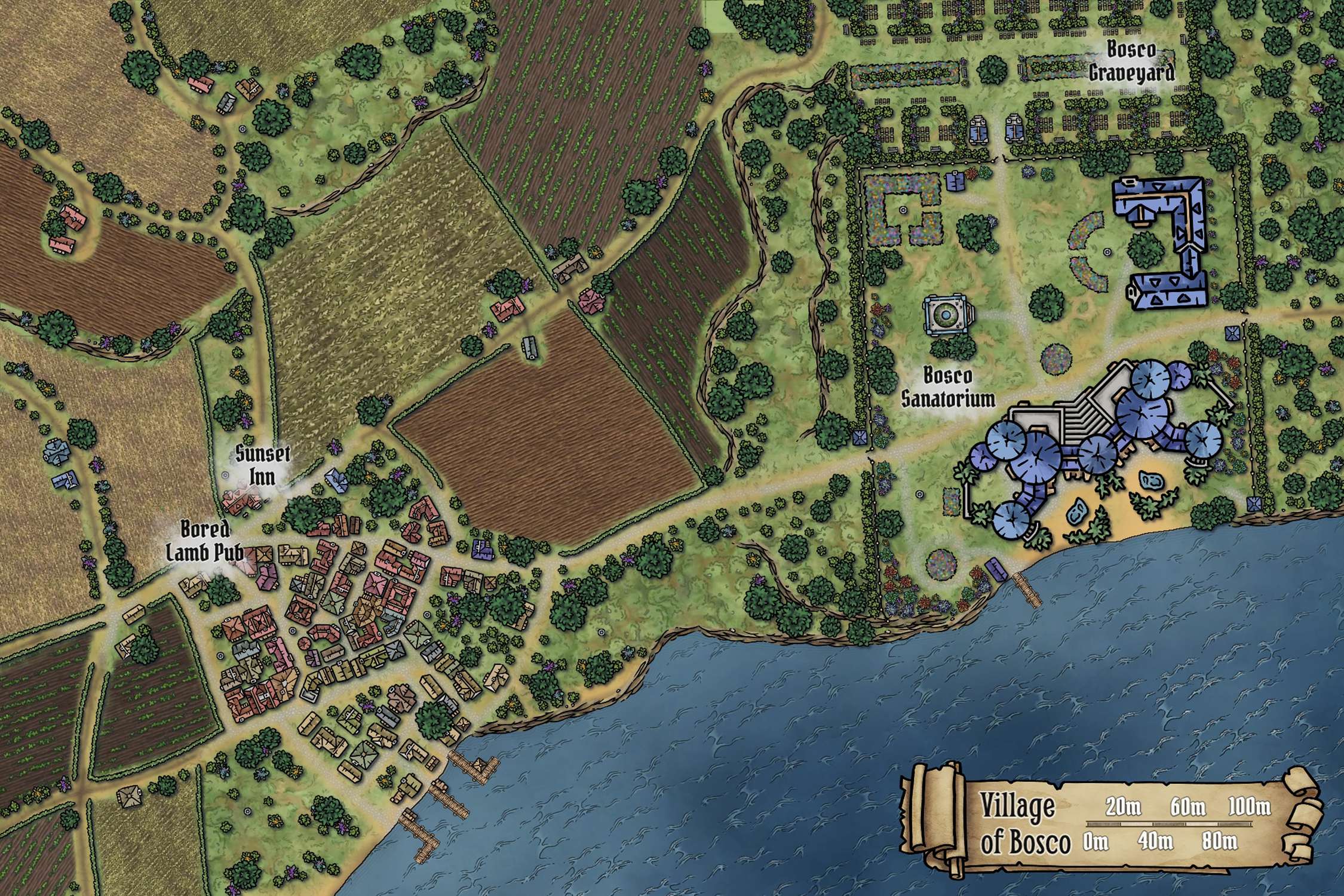 Bosco Docks: As the sun crests the horizon, Bosco fishermen set out for the day’s catch. At night, dozens of wooden boats gently pitch and roll against the wooden docks. The pier is often the first location visitors encounter, and the village stands a welcome sight at all hours. New guests often arrive here, and when Noris expects someone, she send a coach and wagon to shuttle the new arrival to the clinic.